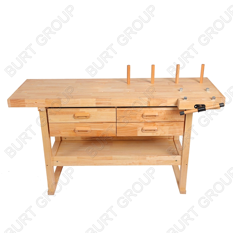 This wooden bench is made of solid rubber wood. A clipboard and 4-integrated drawers with full pull-out offer plenty of storage space. 4-bench hooks made of metal and wood are included in the scope of delivery for workpiece fixation.