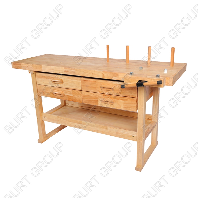 This wooden bench is made of solid rubber wood. A clipboard and 4-integrated drawers with full pull-out offer plenty of storage space. 4-bench hooks made of metal and wood are included in the scope of delivery for workpiece fixation.
