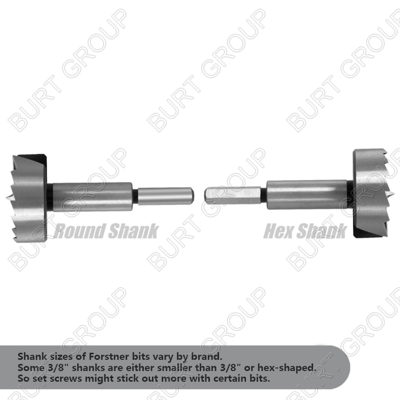 * The forstner bit extender is made from solid, heavy duty machined steel. It is designed to be used with forstner bits only. The collet inside diameter is 3/8 inch. This tolerance is very tight and designed to accept forstner bits with shank sizes of 3/8 inch or slightly smaller. Please note that some forstner bit manufacturers produce bits that say 3/8 inch shank size when in fact they are not. If you measure your bit shank and it is 3/8 inch, your bit should fit once the set screws are loosened