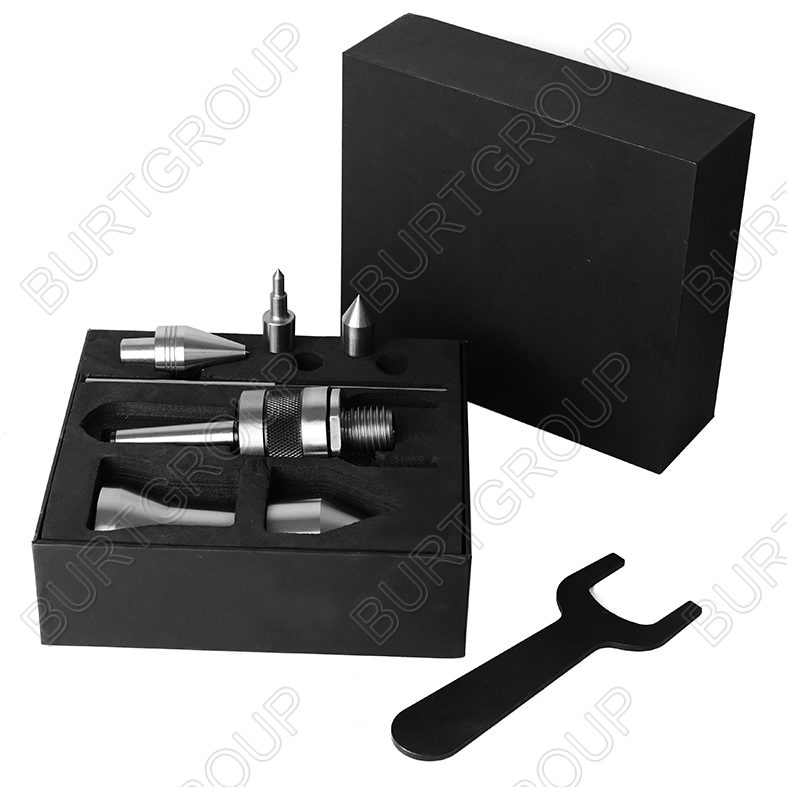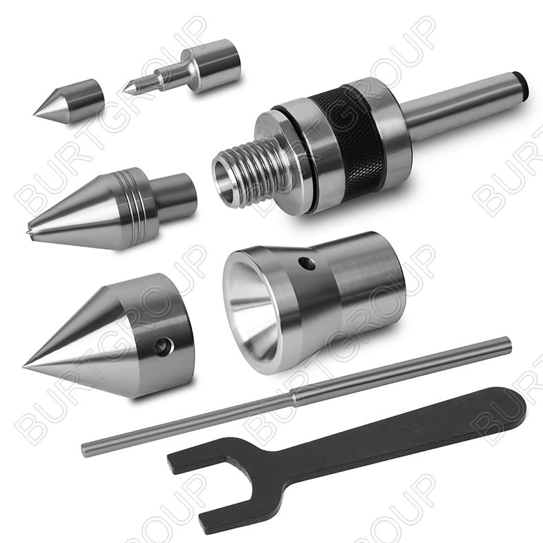 Includes five centers: 2” 60° big cone center, 1-1/5”cup point center, 2-1/5” big cup center, two fine center points, and one knock out rod, one wrench.